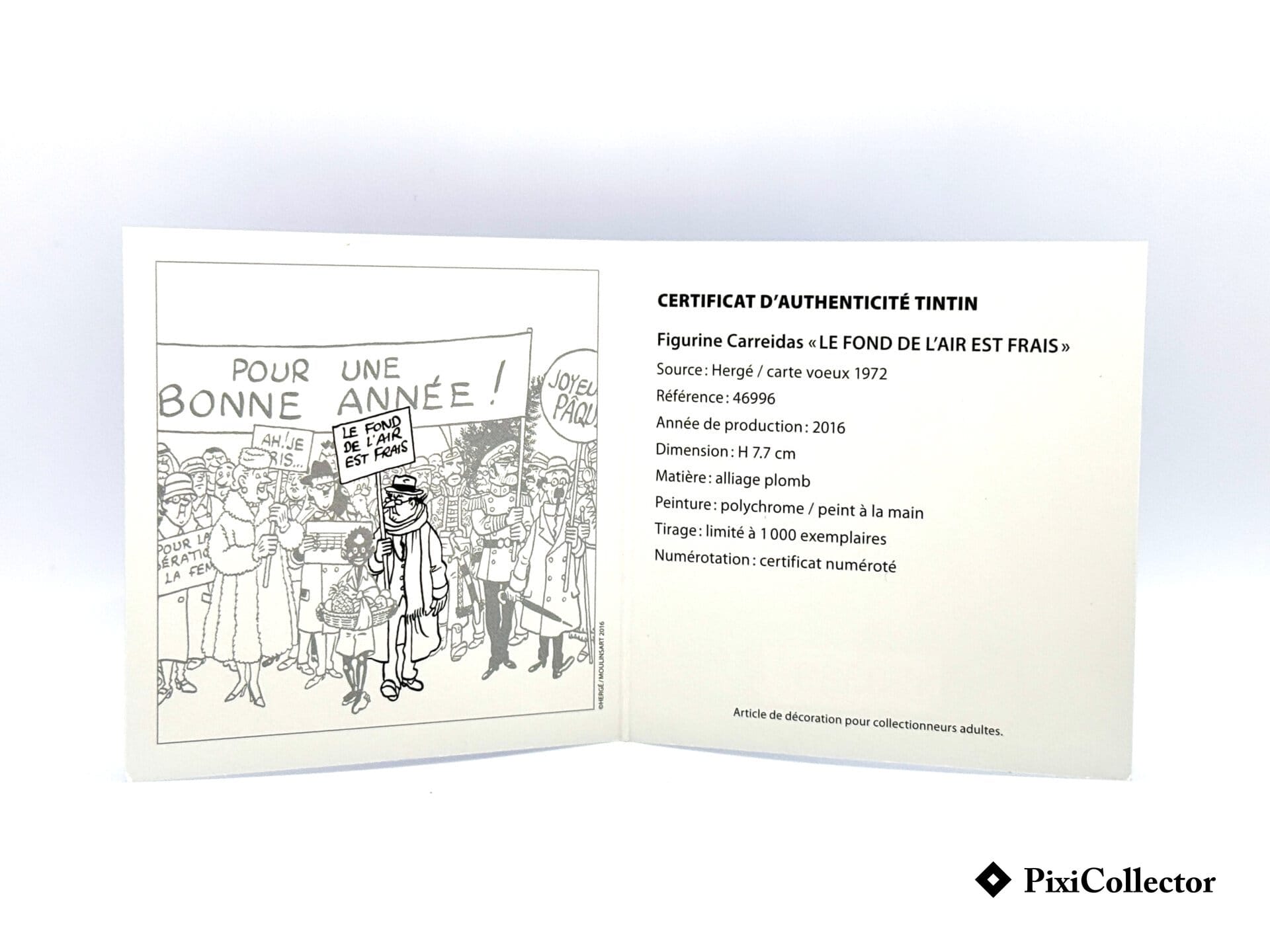 Cette figurine Pixi représente Carreidas, dans une mise en scène directement inspirée de la carte de vœux dessinée par Hergé au début des années 70.