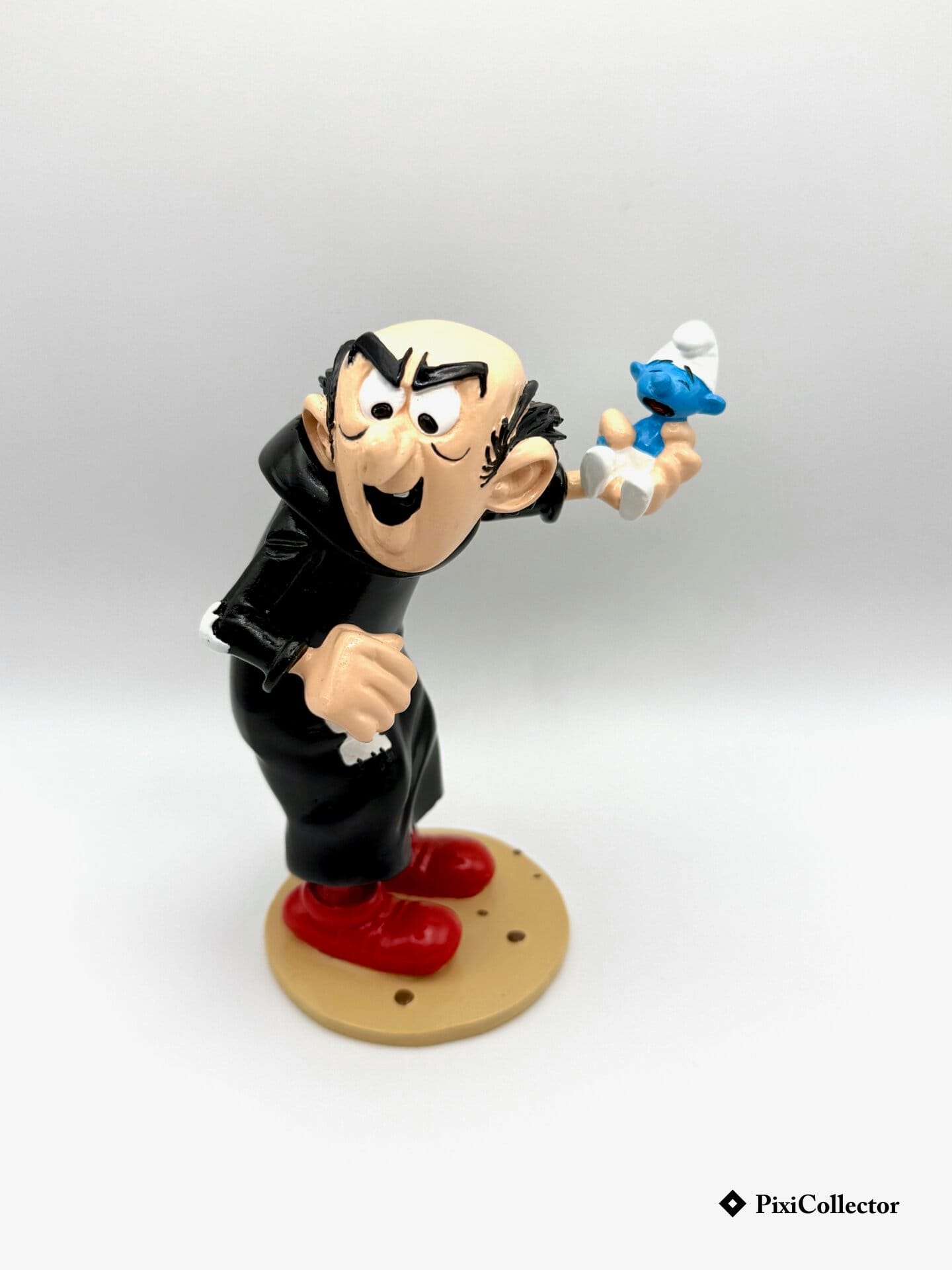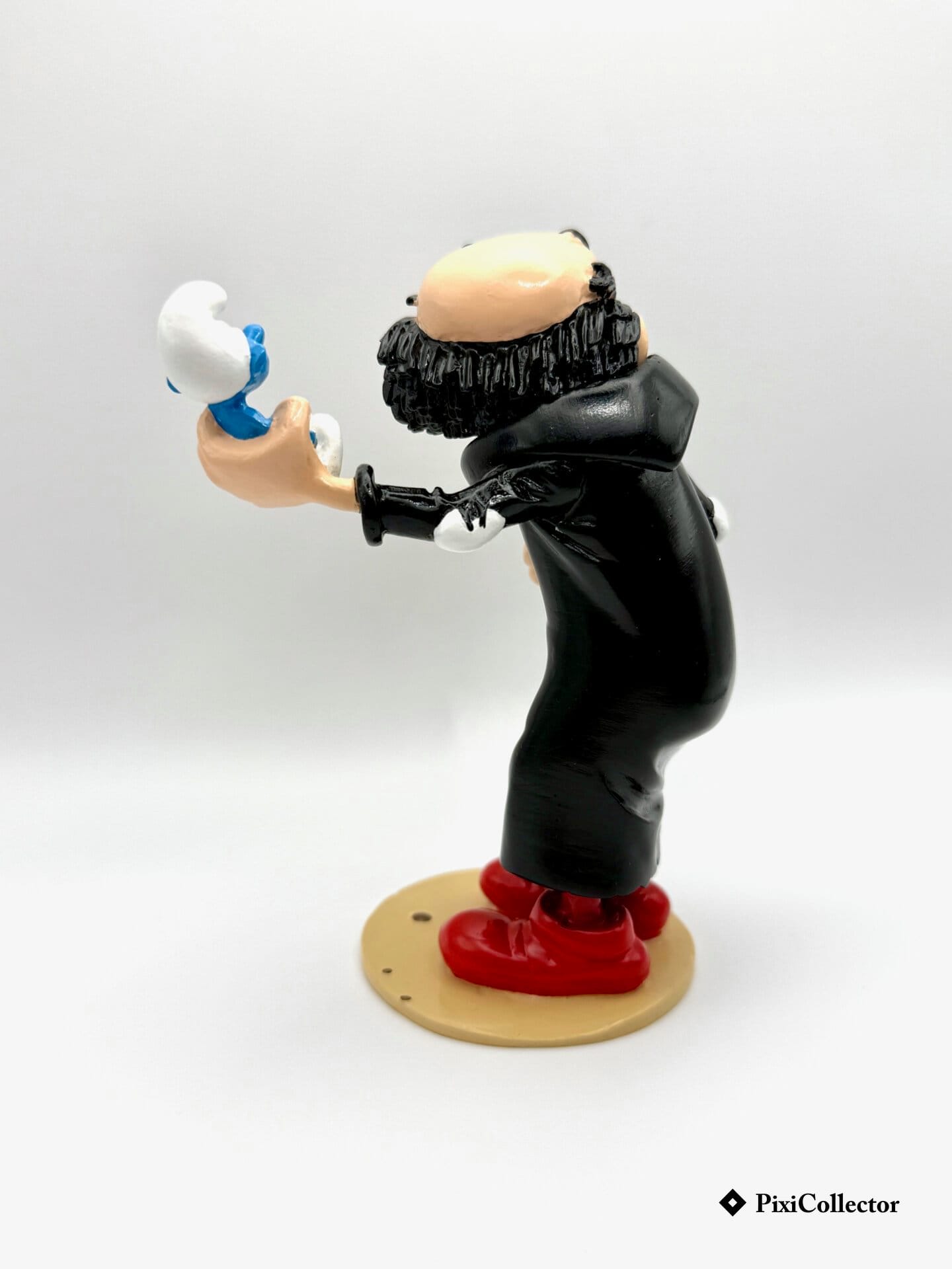 Cette figurine Pixi met en scène Gargamel et un Schtroumpf prisonnier, dans une situation fidèle à l’univers de Peyo.