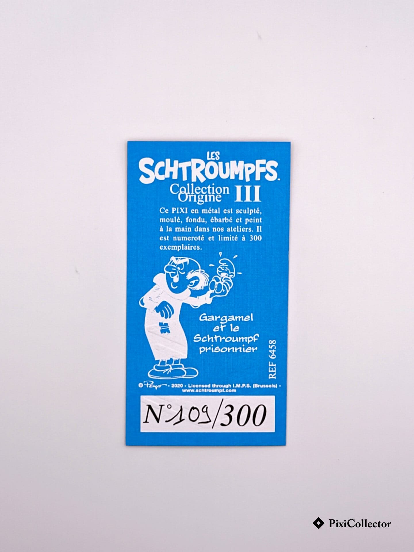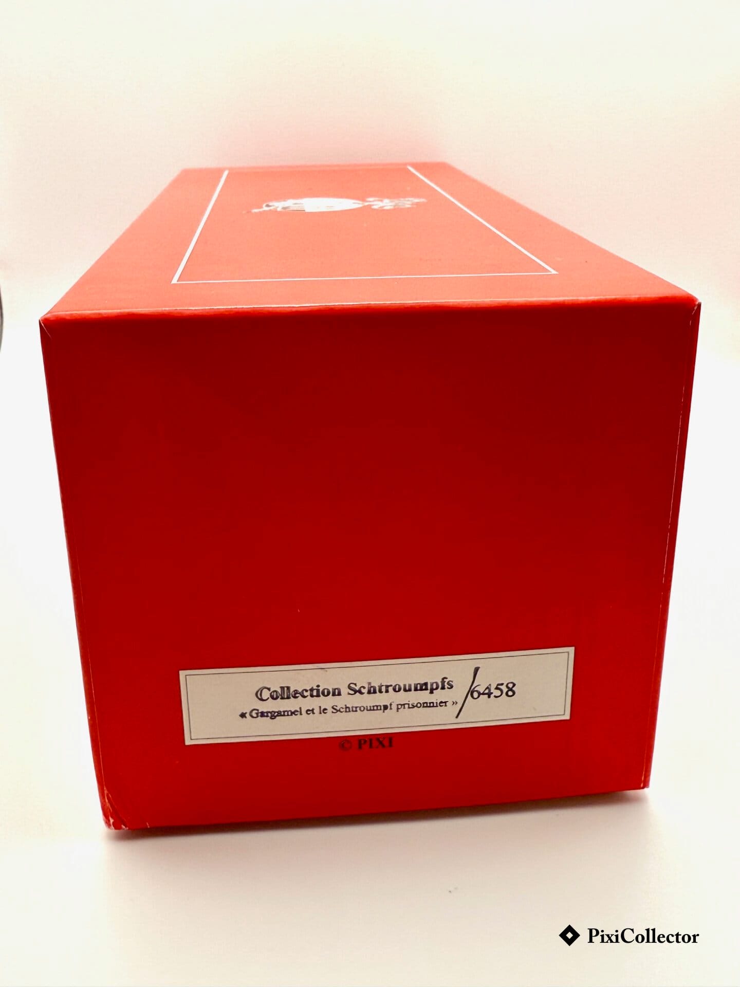 Figurine Pixi: Gargamel et le Schtroumpf prisonnier (réf. 6458).