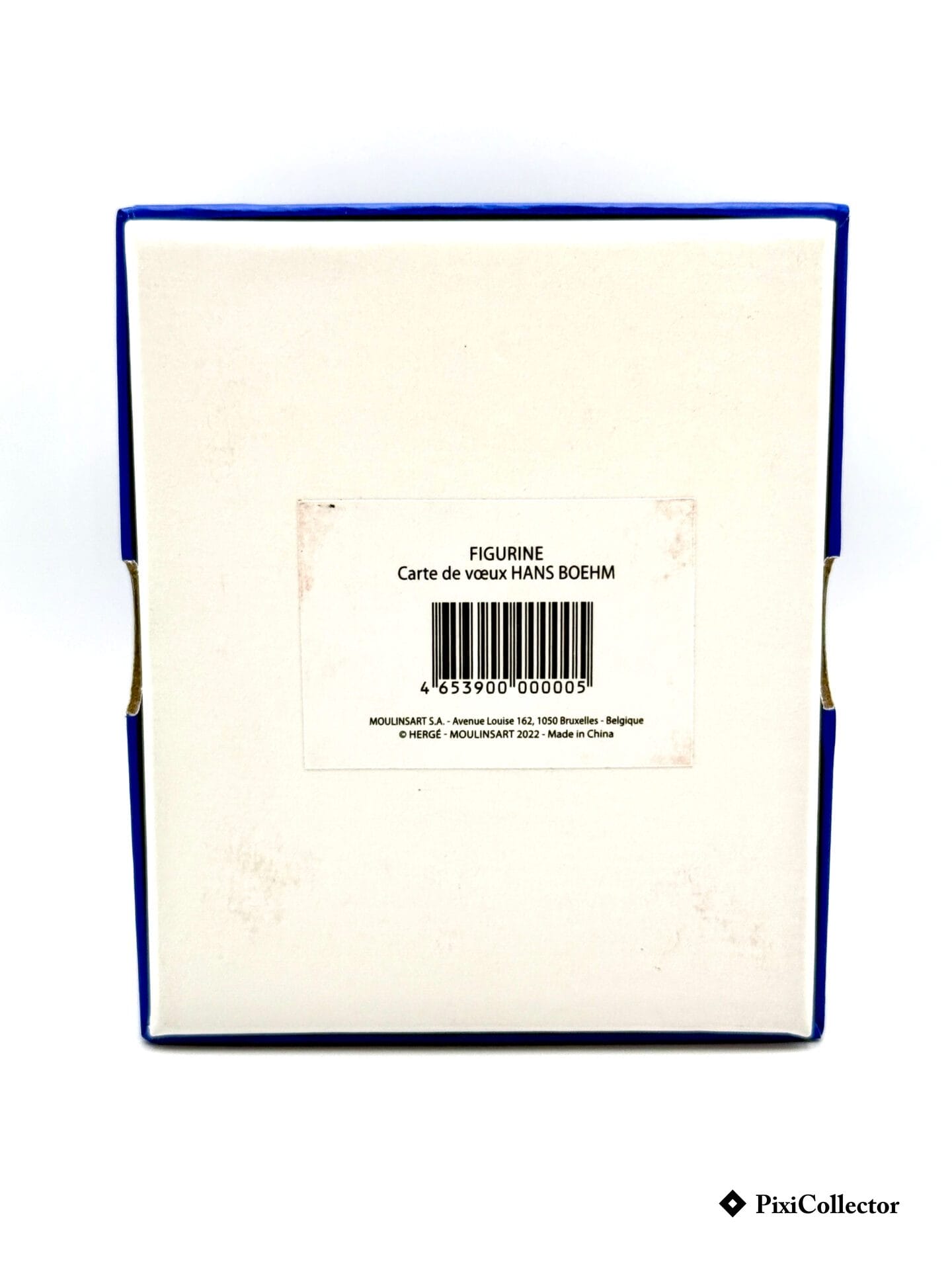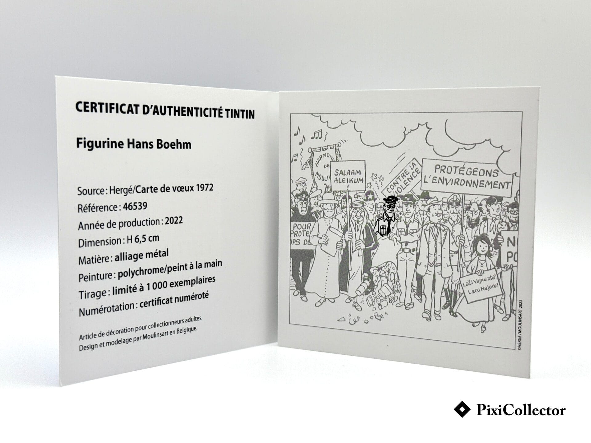 Cette figurine Pixi représente Hans Boehm, personnage secondaire des aventures de Tintin, dans une mise en scène directement inspirée de la carte de vœux dessinée par Hergé au début des années 70.