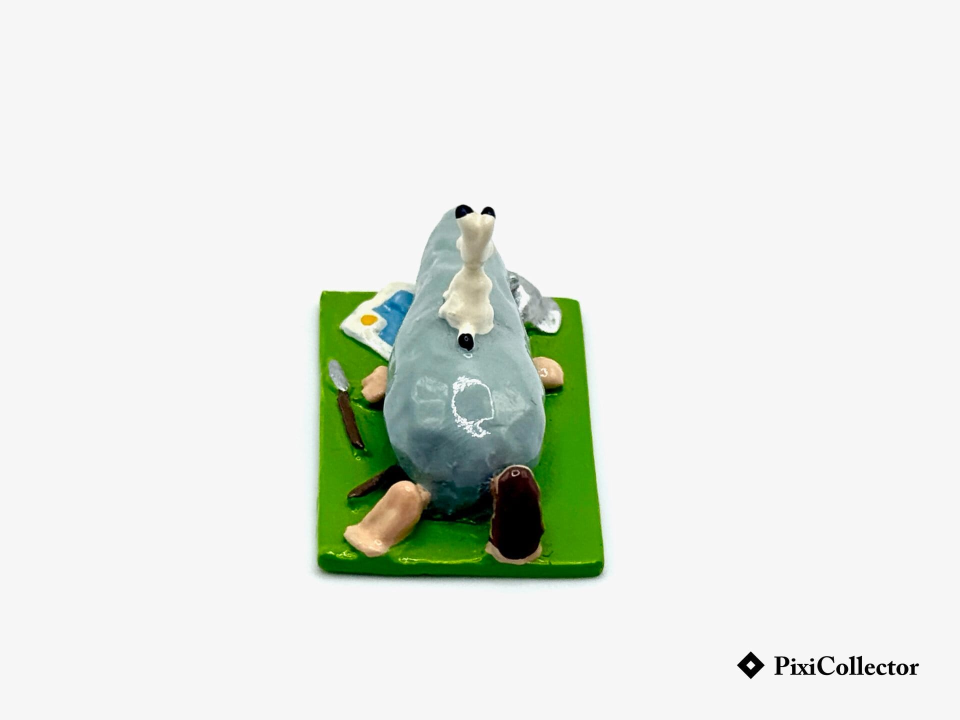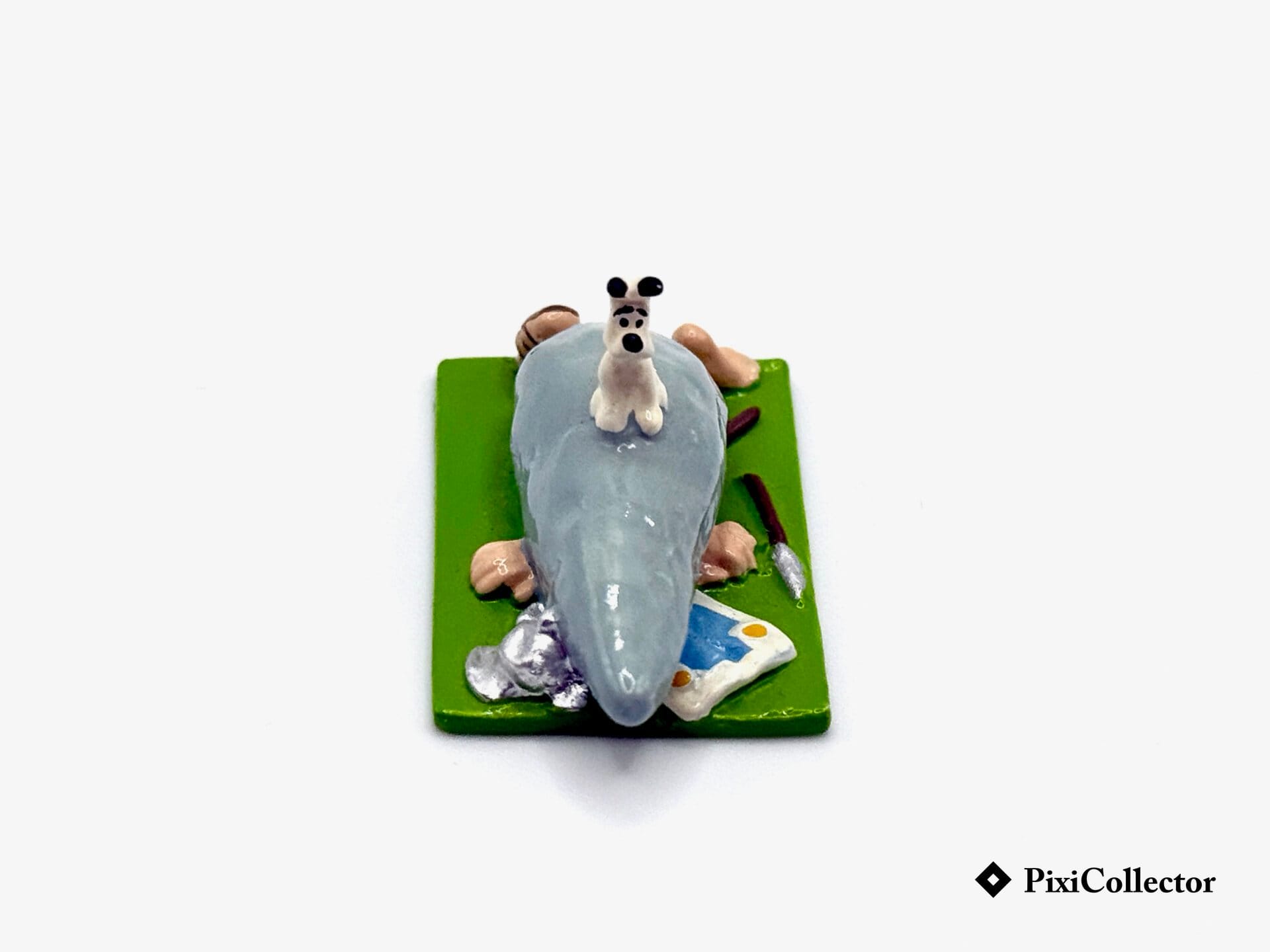 Cette figurine Pixi représente Idefix assis sur une grosse pierre qui a écrasé le romain, dans une mise en scène inspirée de l’univers « Astérix » imaginé par Goscinny et Uderzo.