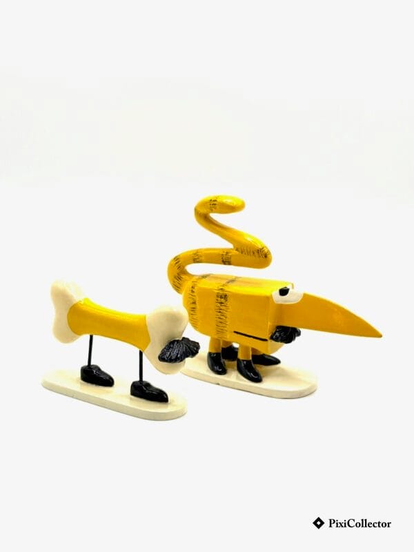 Cette figurine Pixi représente Minetcanthrope avec son squelette, dans une mise en scène inspirée de l’univers décalé des Shadoks de Jacques Rouxel.