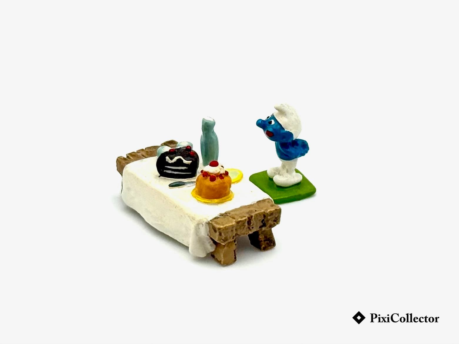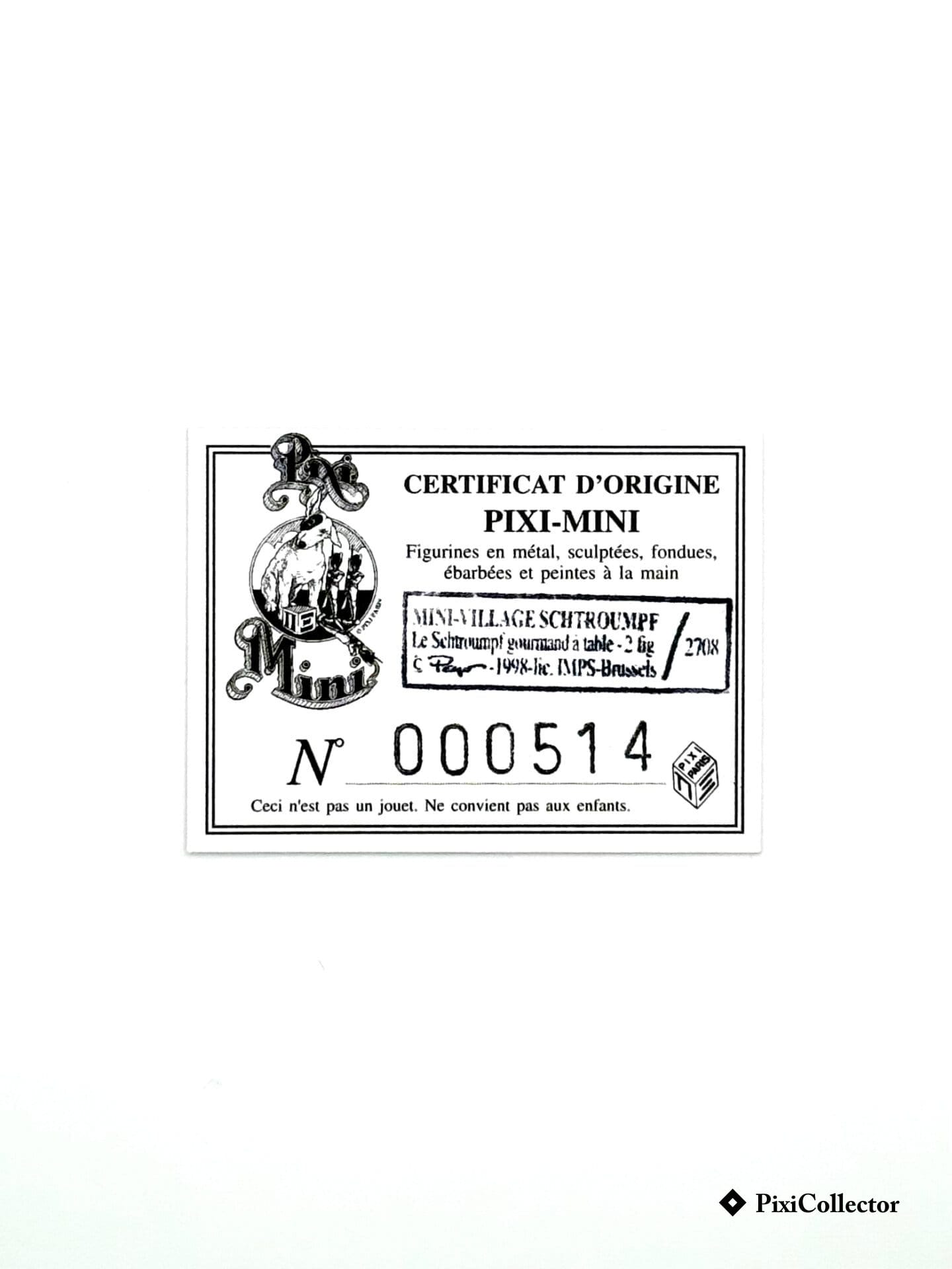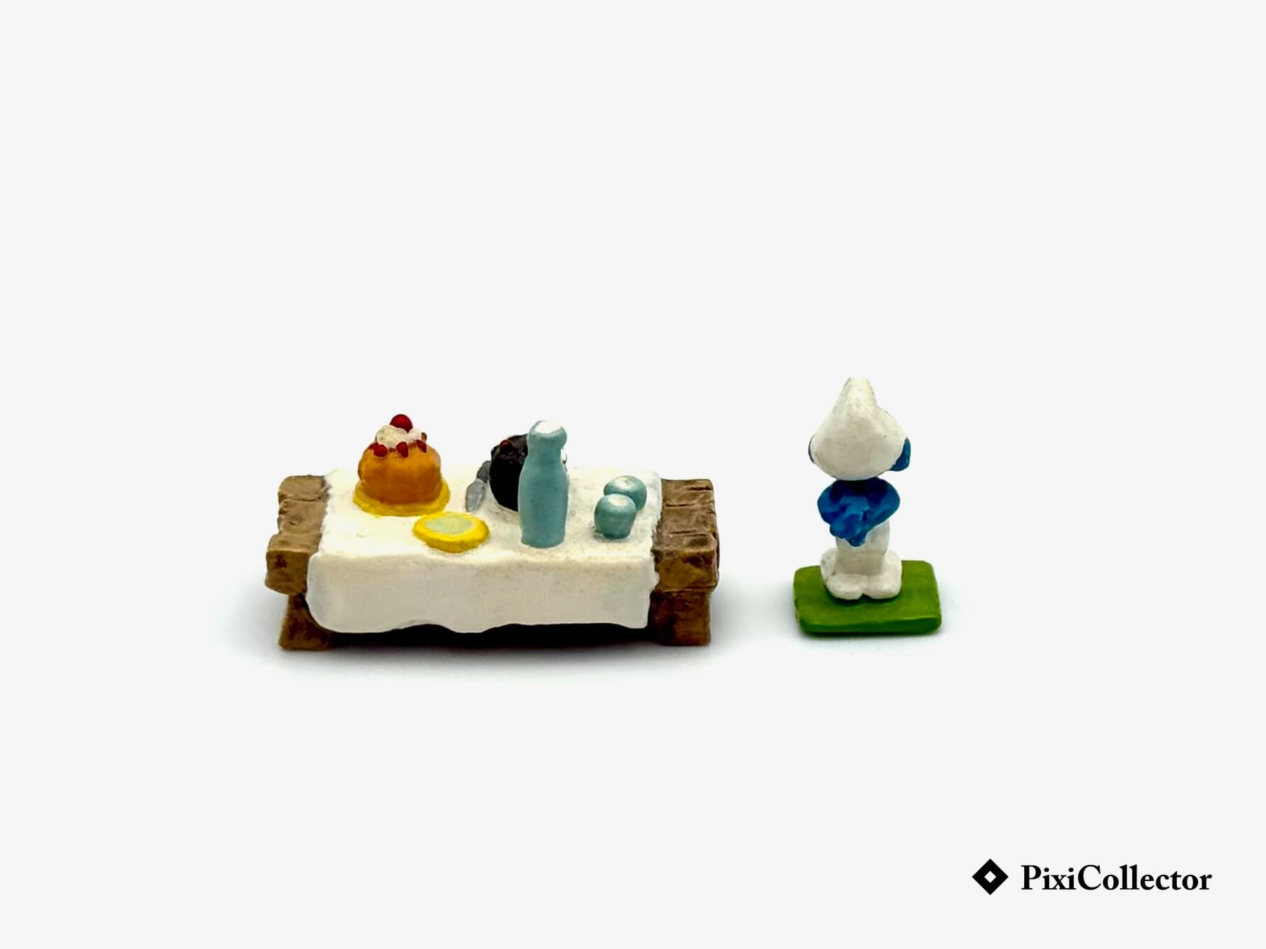 Ensemble de 2 figurines Pixi Schtroumpfs Mini Village : Le Schtroumpf Gourmand à table – 2 fig. (réf. 2708).