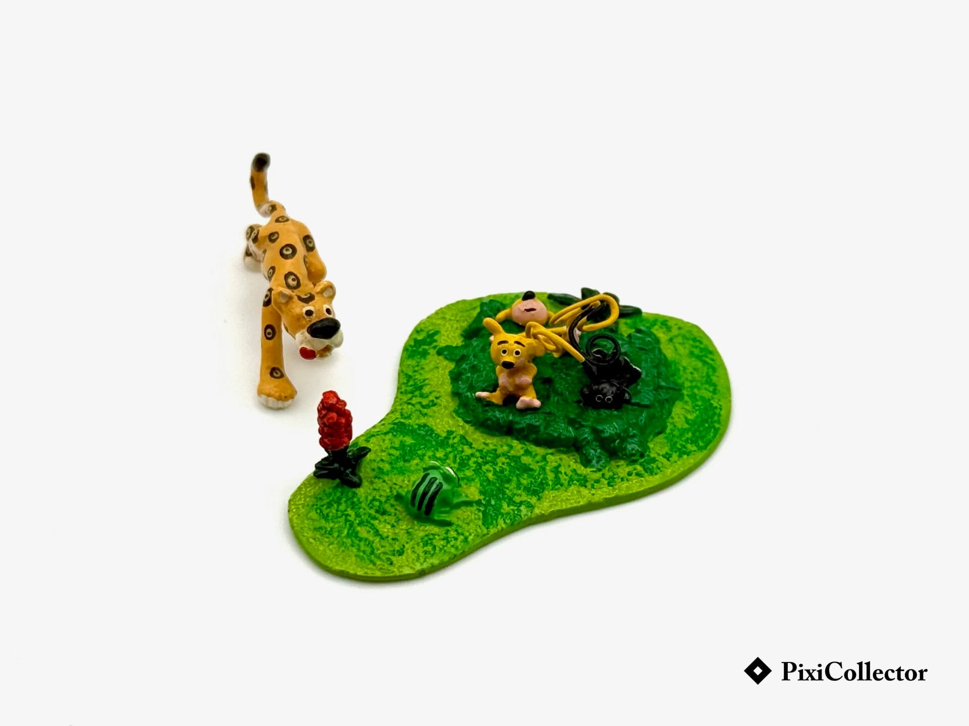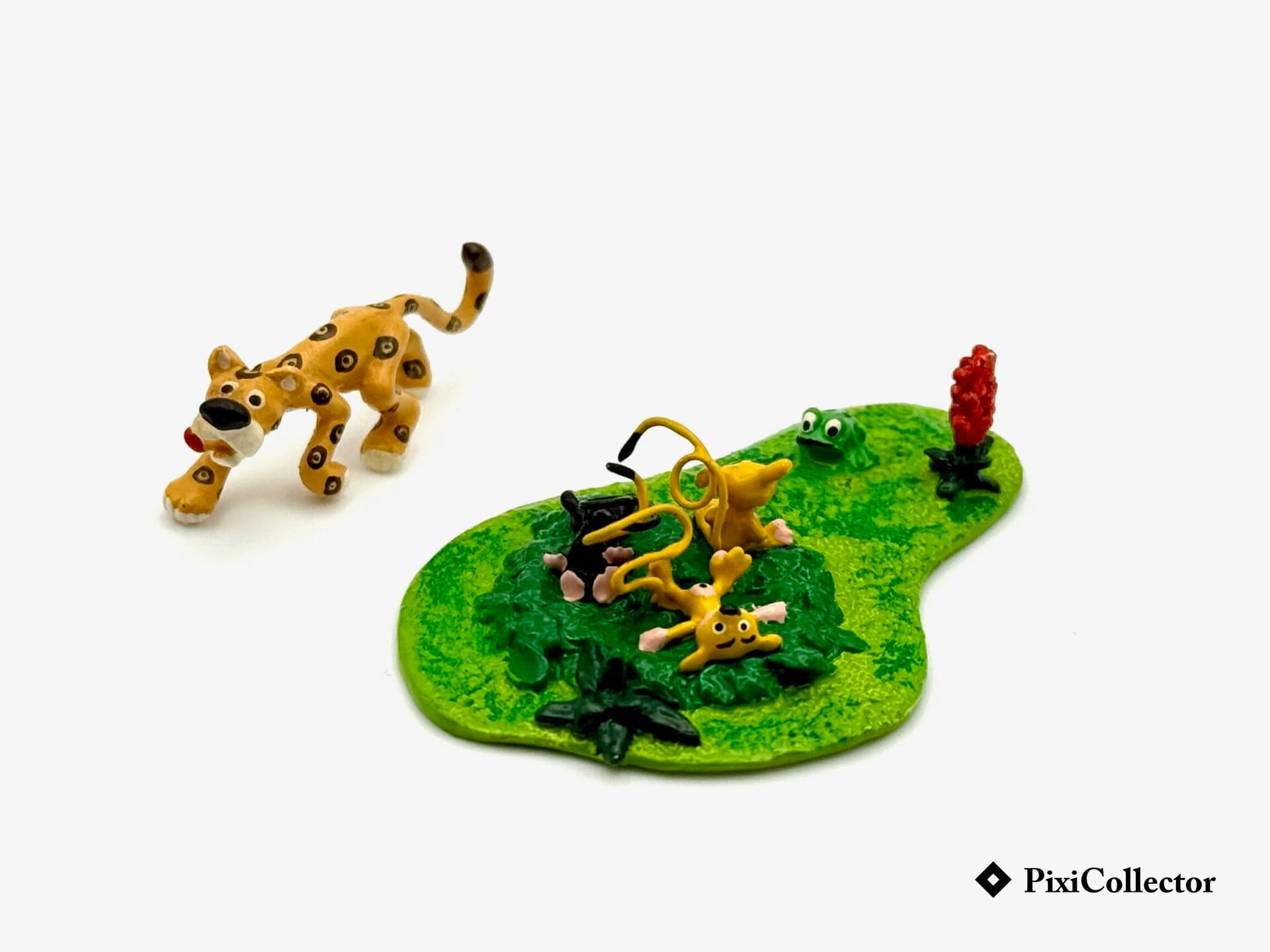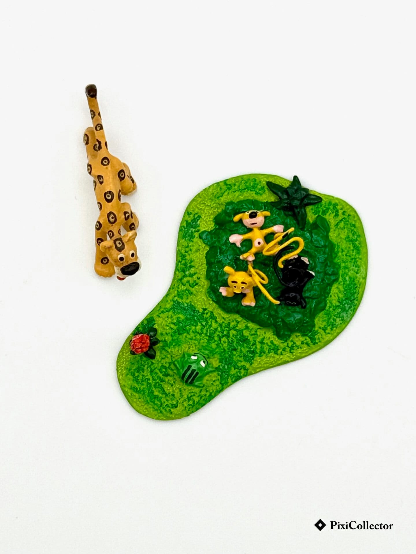 Cette figurine Pixi réunit trois bébés Marsupilami face à un jaguar, une scène de jungle tendre et mouvementée, fidèle aux seconds rôles de l’univers « Marsupilami ».