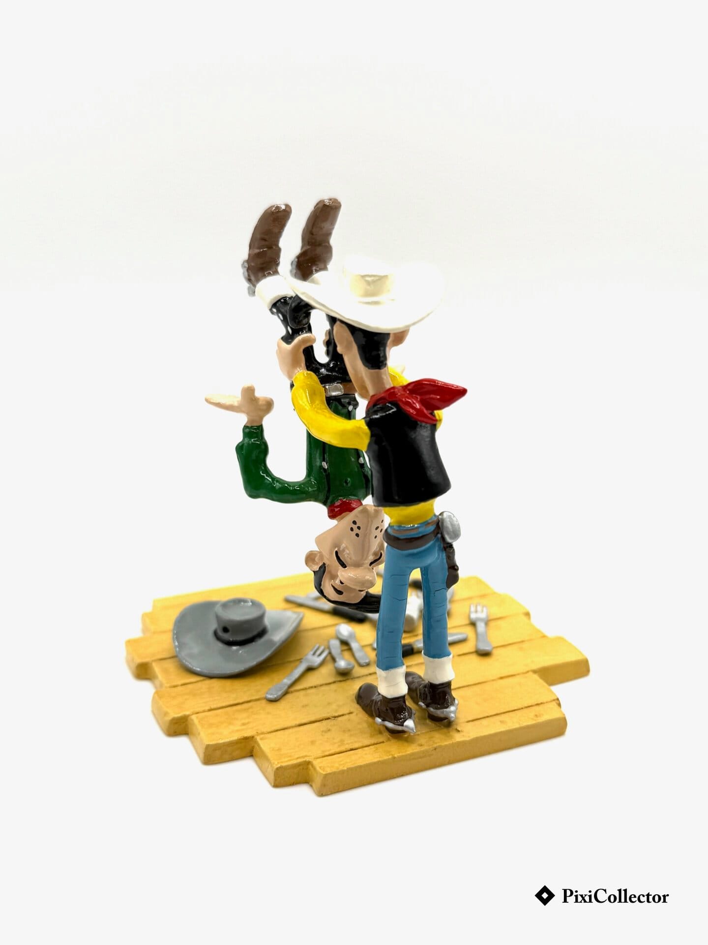 Cette figurine Pixi représente Lucky Luke et Averell, dans une mise en scène inspirée de la bande dessinée « Lucky Luke » créé par Morris.