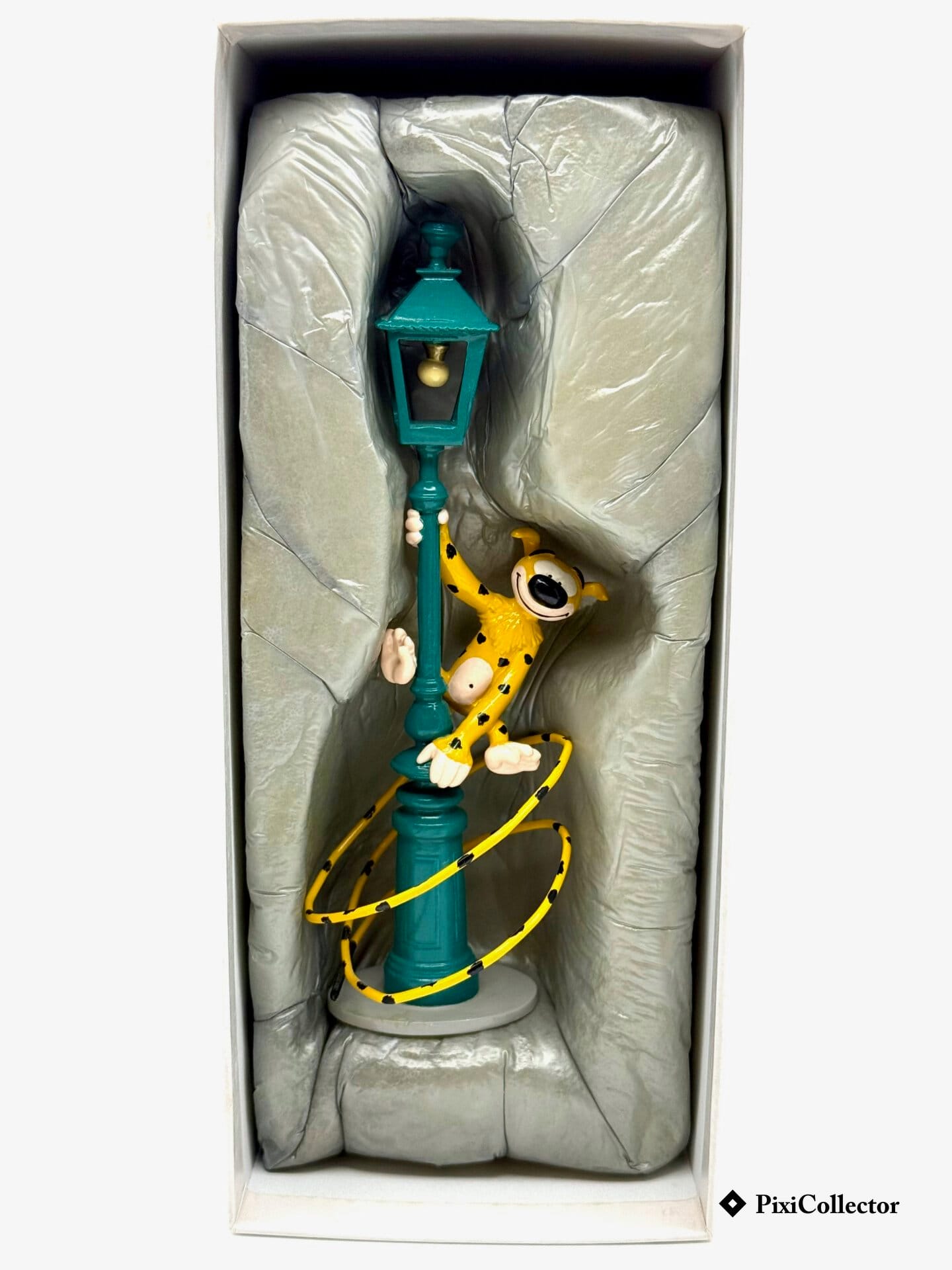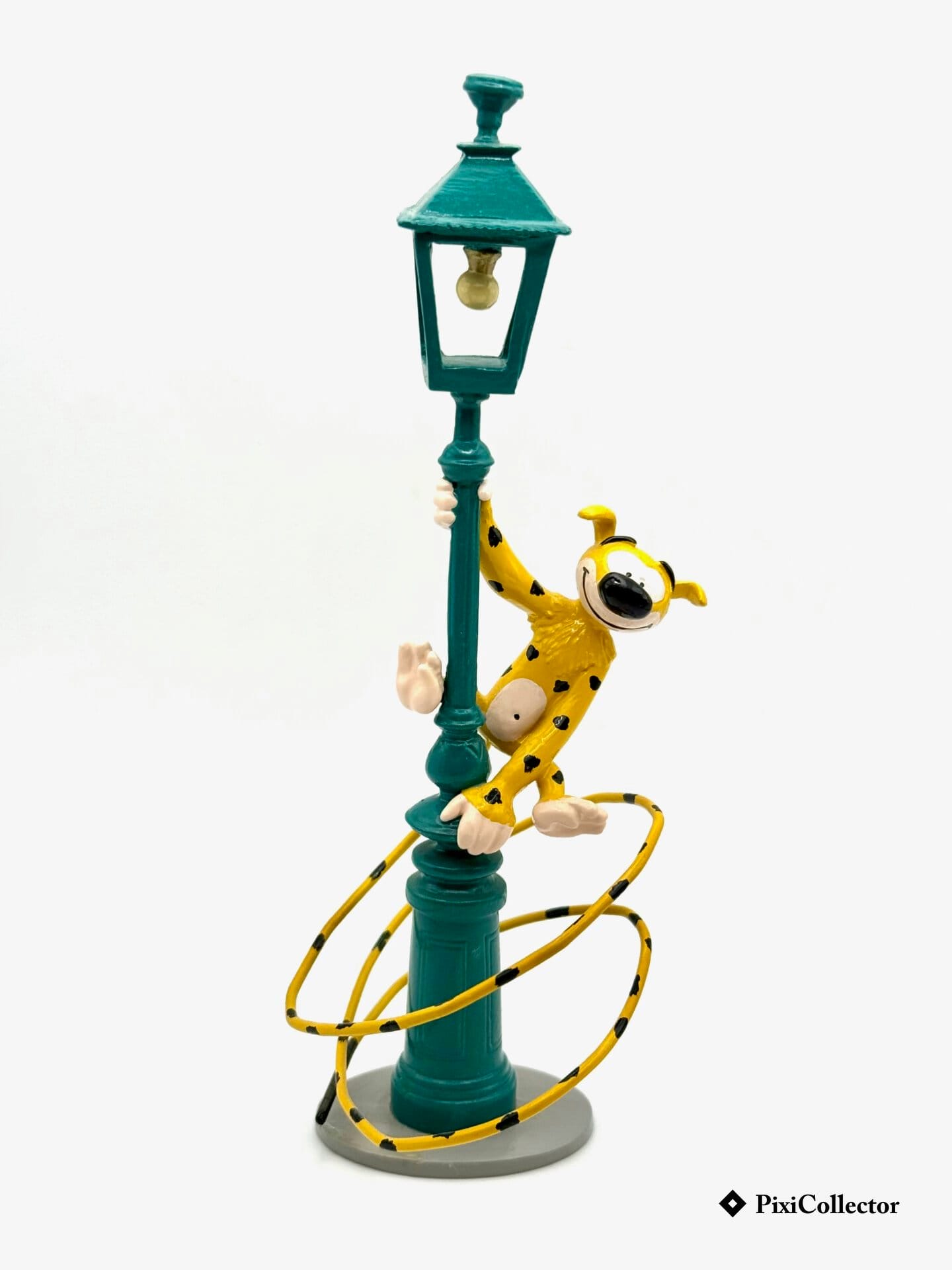 Cette figurine Pixi présente le Marsupilami installé autour d’un lampadaire. Un décor du quotidien détourné en scène drôle, dans l’esprit de l’univers « Marsupilami ».