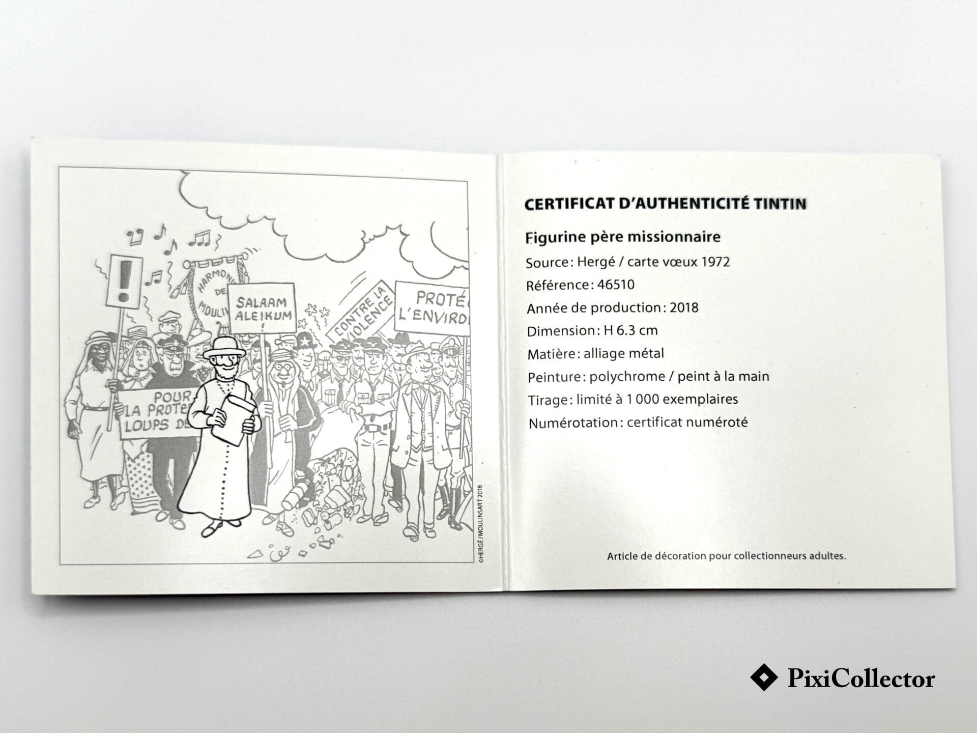 Cette figurine Pixi représente un Père Missionnaire, figure secondaire mais marquante de l’univers de Tintin, dans une mise en scène directement inspirée de la carte de vœux dessinée par Hergé au début des années 70.