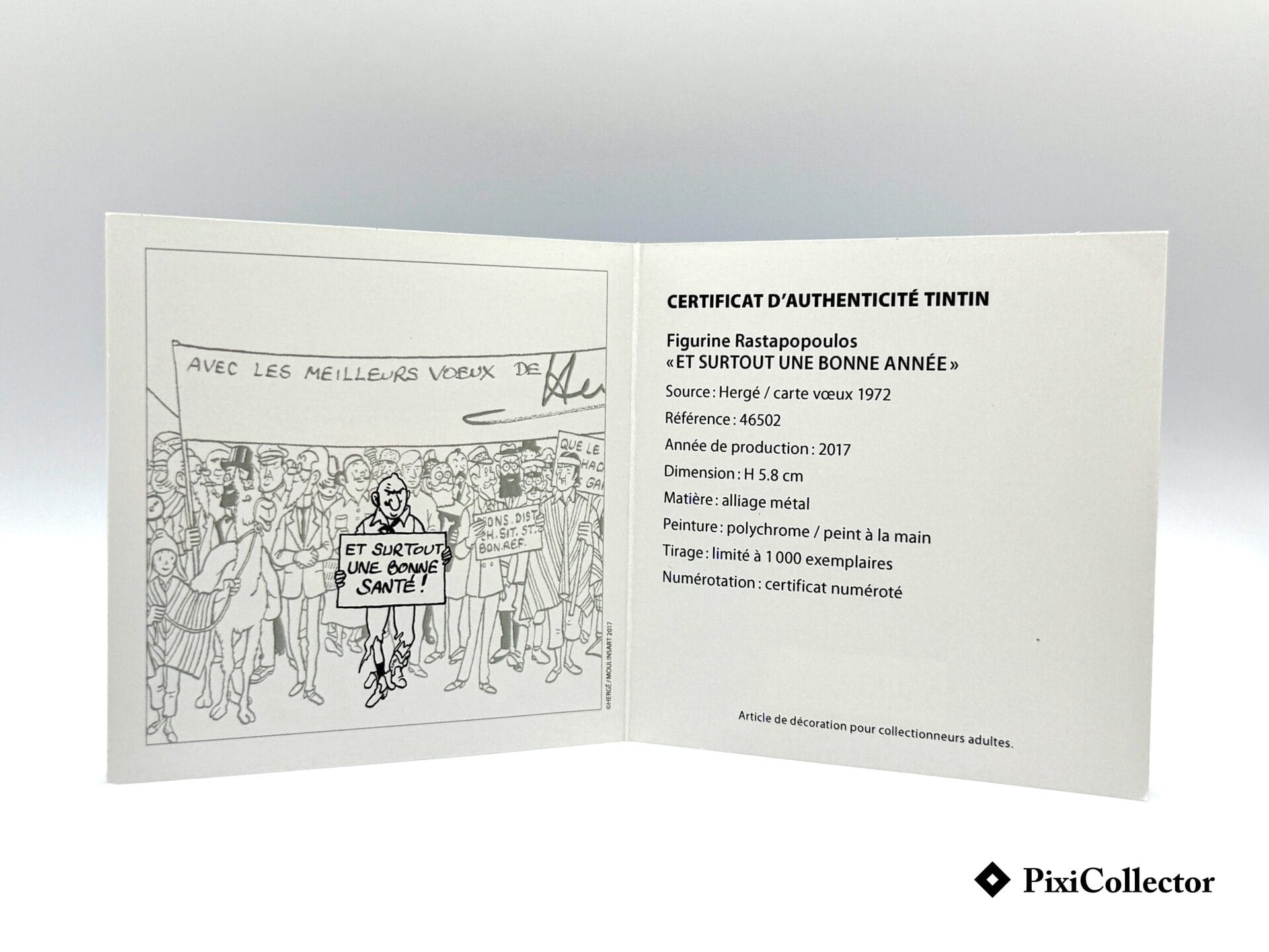 Tirée à seulement 1000 exemplaires et éditée en 2017, cette pièce en métal, peinte à la main, fait partie de la collection officielle «Carte de Vœux 1972», recherchée par les collectionneurs de Tintin et de ses personnages secondaires.