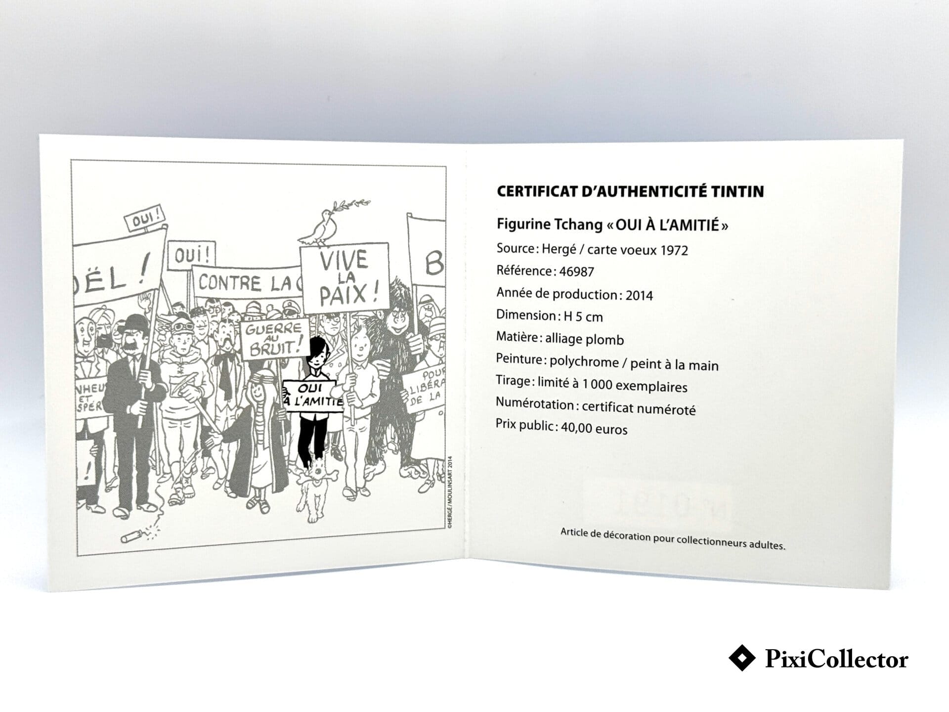 Cette figurine Pixi représente Tchang « Oui à l’amitie », dans une mise en scène directement inspirée de la carte de vœux dessinée par Hergé au début des années 70.