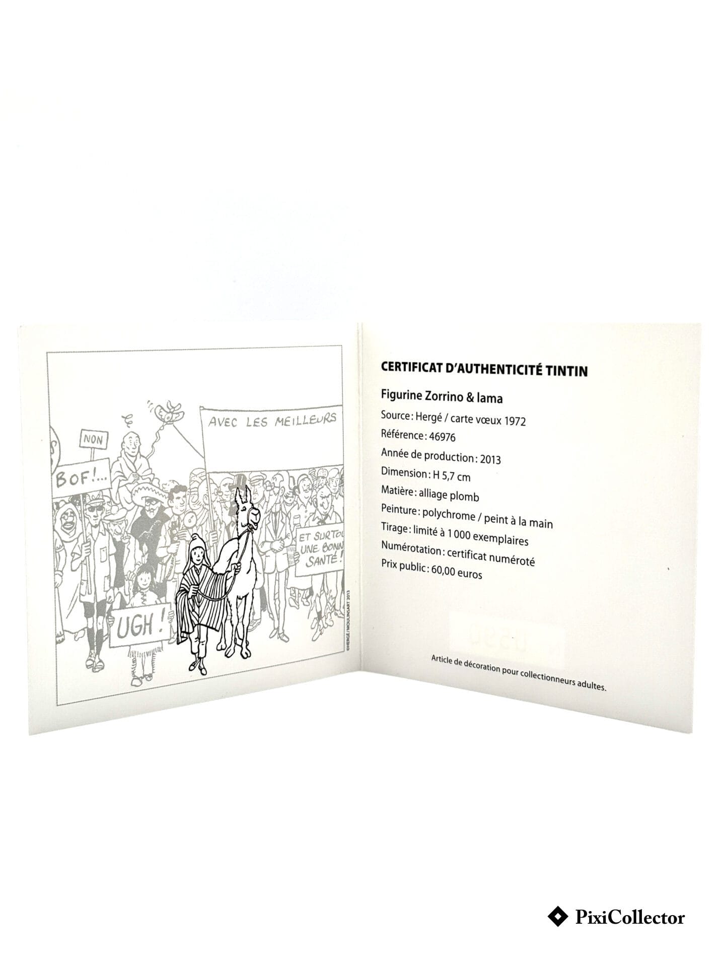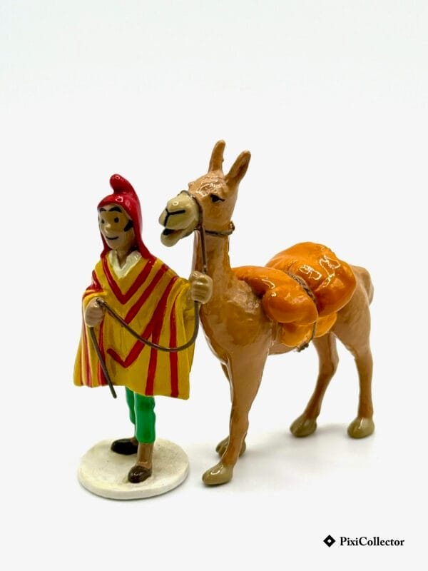 Cette figurine Pixi représente Zorrino tenant son lama, personnage issu des aventures andines de Tintin, dans une mise en scène directement inspirée de la carte de vœux dessinée par Hergé au début des années 70.